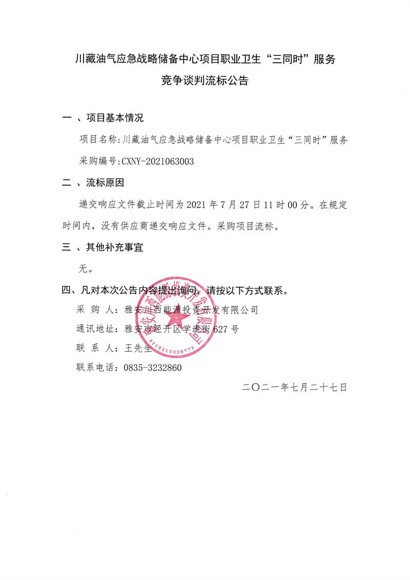 雅安川西能源投資開(kāi)發(fā)有限公司川藏油氣應(yīng)急戰(zhàn)略?xún)?chǔ)備中心項(xiàng)目職業(yè)衛(wèi)生“三同時(shí)”服務(wù)競(jìng)爭(zhēng)談判流標(biāo)公告