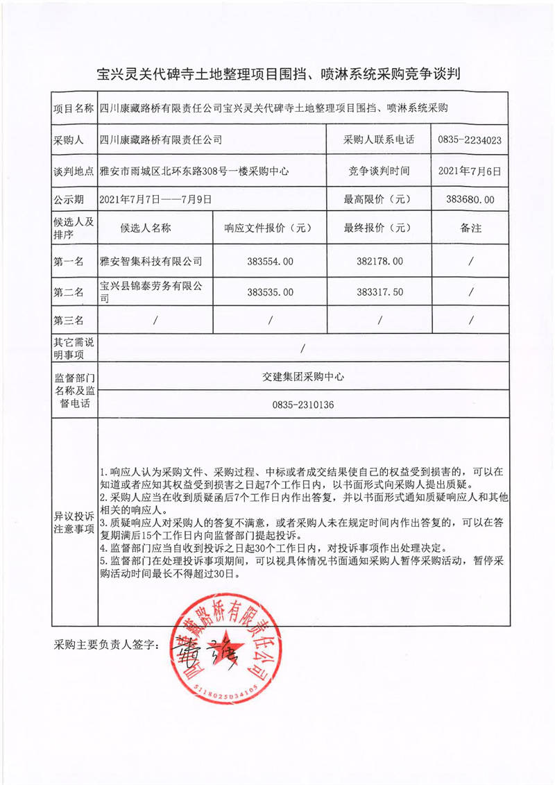 四川康藏路橋有限責(zé)任公司寶興靈關(guān)代碑寺土地整理工程項(xiàng)目圍擋、噴淋系統(tǒng)采購競(jìng)爭(zhēng)談判結(jié)果公示
