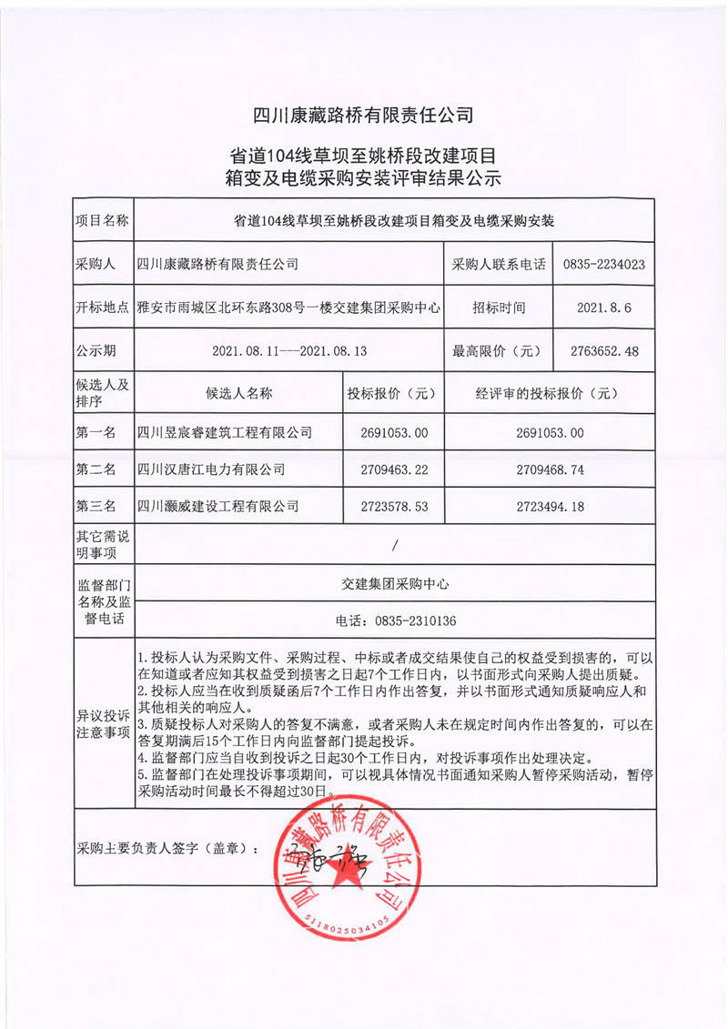 四川康藏路橋有限責(zé)任公司省道104線草壩至姚橋段改建項目箱變及電纜采購安裝評審結(jié)果公示