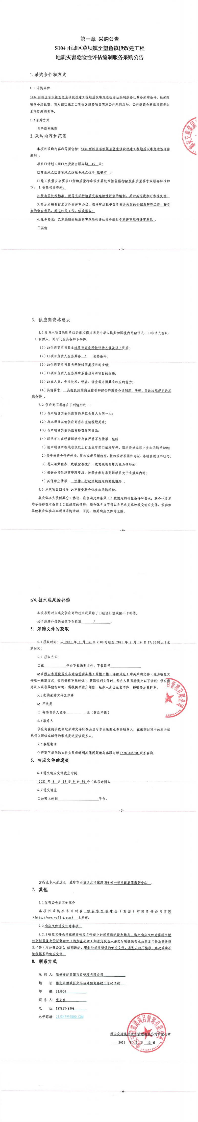 雅安交建集團項目管理有限公司S104雨城區(qū)草壩鎮(zhèn)至望魚鎮(zhèn)段改建工程地質(zhì)災(zāi)害危險性評估編制服務(wù)采購公告