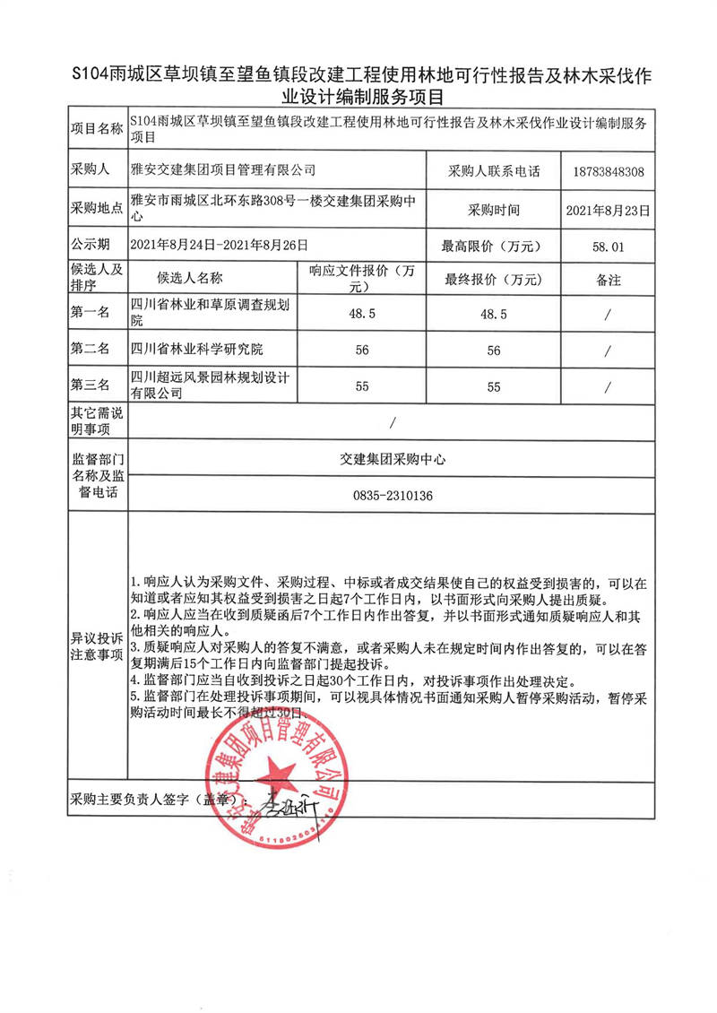 雅安交建集團(tuán)項目管理有限公司S104雨城區(qū)草壩鎮(zhèn)至望魚鎮(zhèn)段改建工程使用林地可行性報告及林木采伐作業(yè)設(shè)計編制服務(wù)項目評審結(jié)果公示