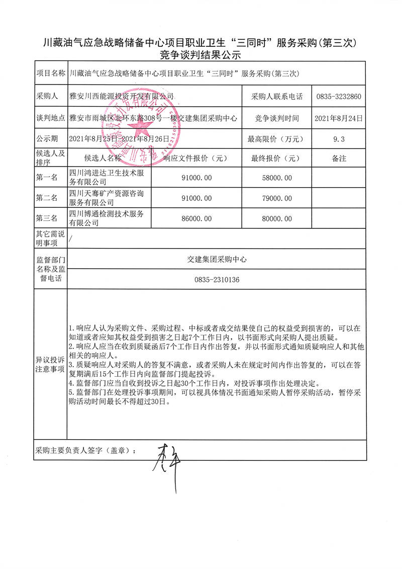 雅安川西能源投資開發(fā)有限公司川藏油氣應(yīng)急戰(zhàn)略儲備中心項目職業(yè)衛(wèi)生“三同時”服務(wù)采購(第三次)競爭談判結(jié)果公示