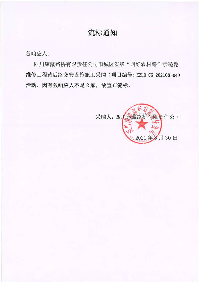 四川康藏路橋有限責任公司雨城區(qū)省級“四好農(nóng)村路”示范路維修工程黃后路交安設施施工采購流標通知