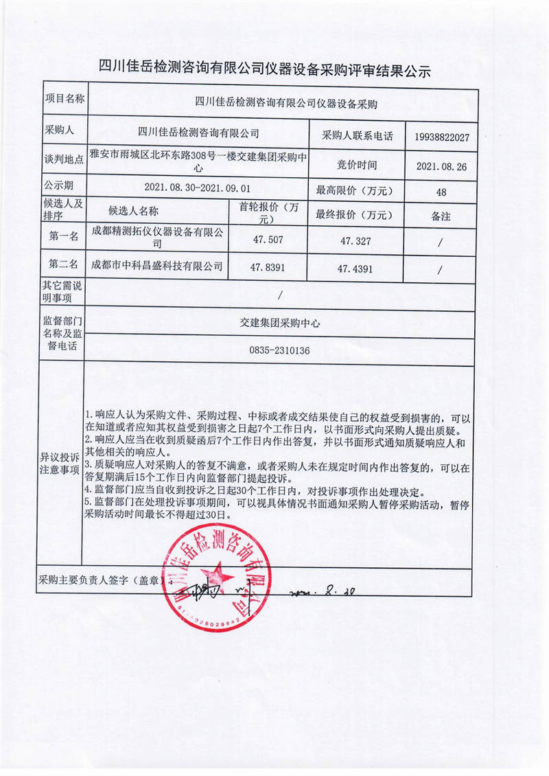四川佳岳檢測(cè)咨詢(xún)有限公司儀器設(shè)備采購(gòu)評(píng)審結(jié)果公示