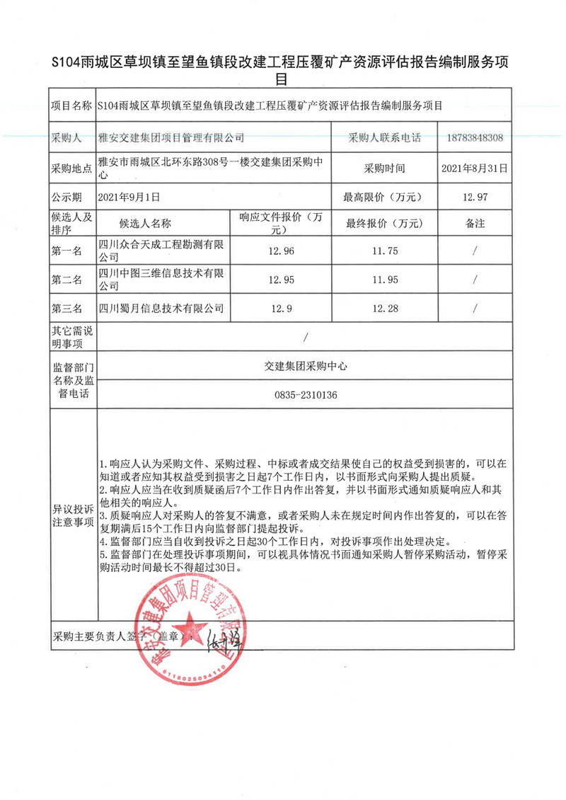 雅安交建集團項目管理有限公司S104雨城區(qū)草壩鎮(zhèn)至望魚鎮(zhèn)段改建工程壓覆礦產(chǎn)資源評估報告編制服務(wù)項目評審結(jié)果公示