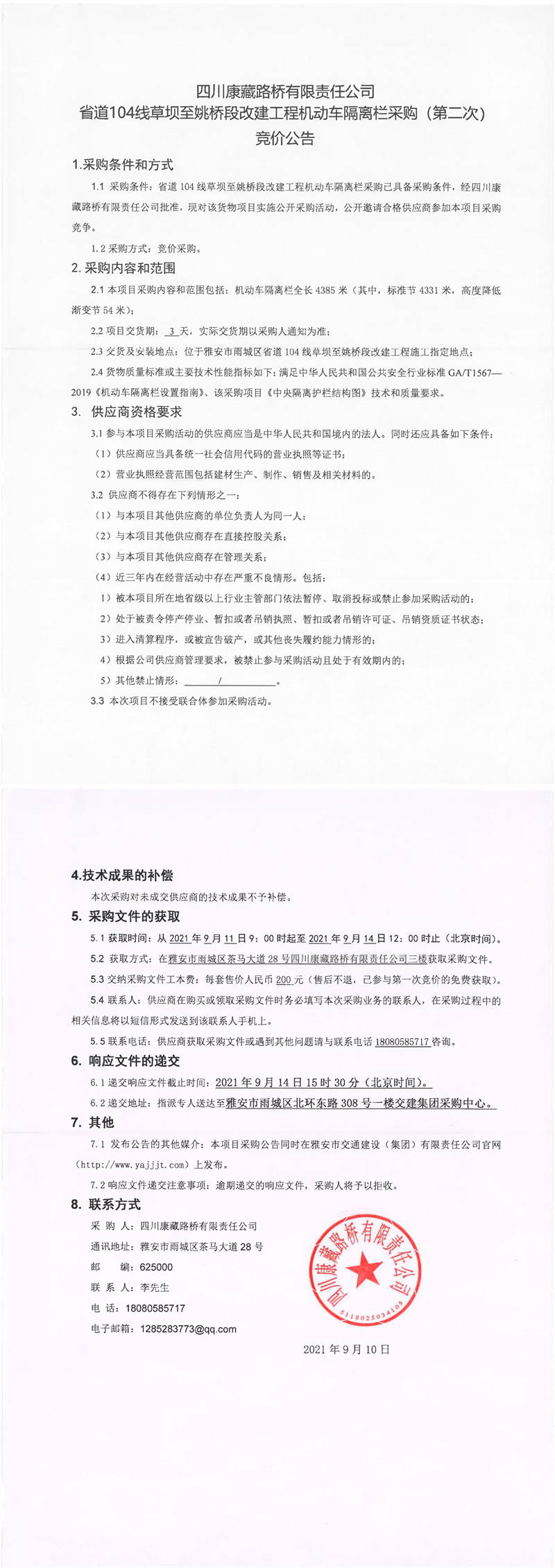 四川康藏路橋有限責(zé)任公司省道104線草壩至姚橋段改建工程機動車隔離欄采購(第二次)競價公告