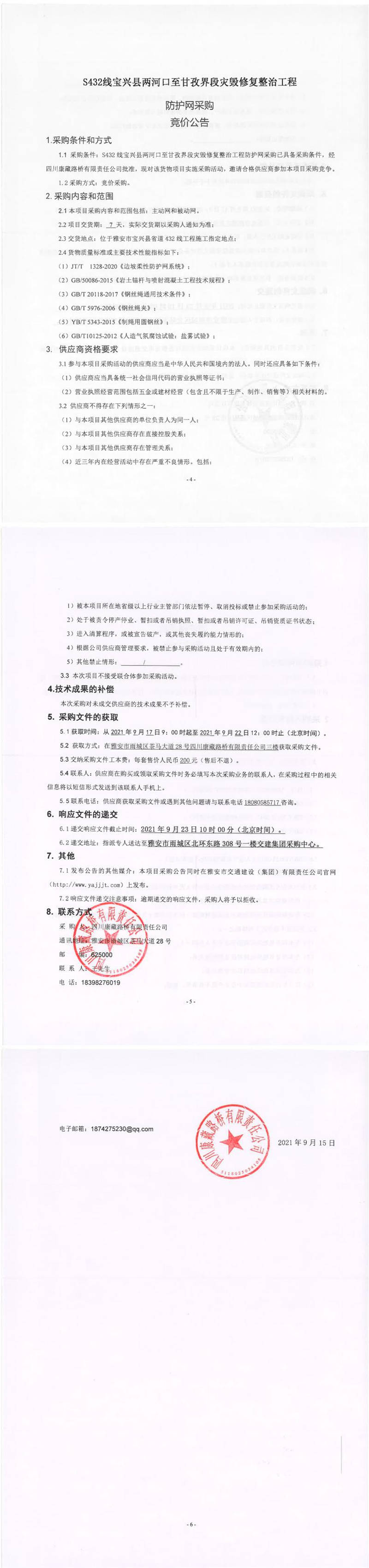 四川康藏路橋有限責(zé)任公司S432線寶興縣兩河口至甘孜界段災(zāi)毀修復(fù)整治工程防護(hù)網(wǎng)采購競價公告