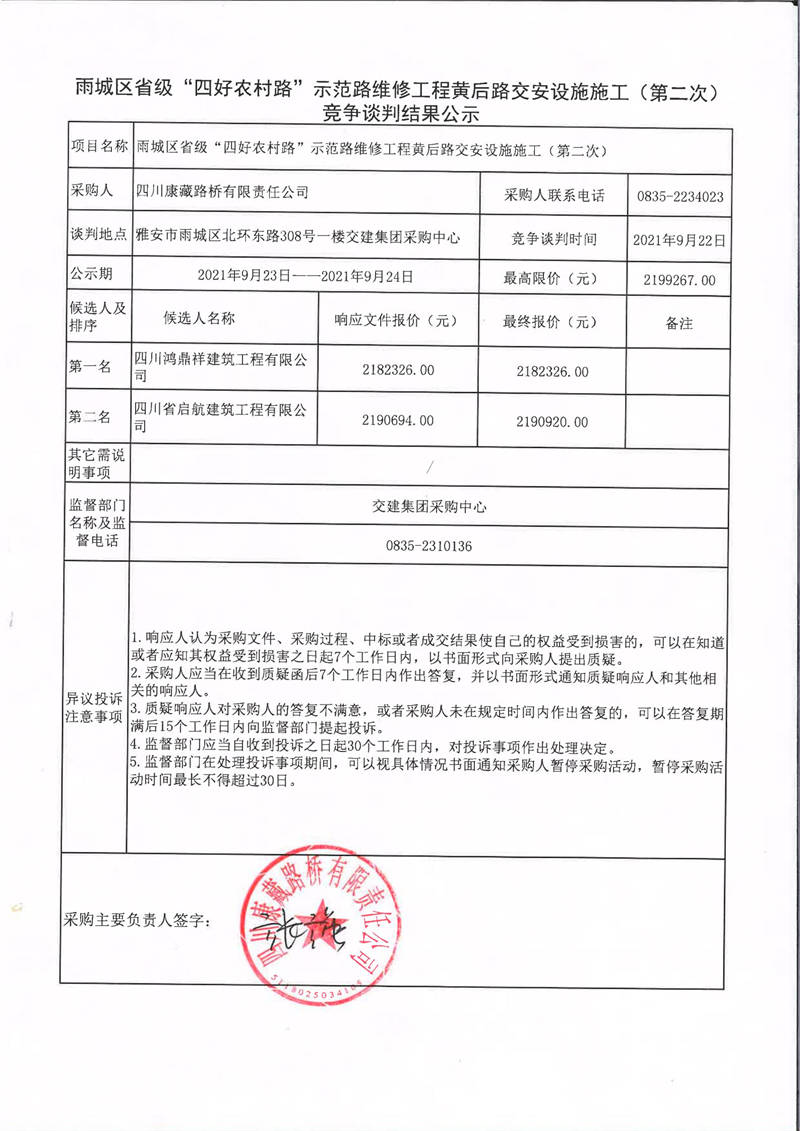 四川康藏路橋有限責任公司雨城區(qū)省級“四好農(nóng)村路”示范路維修工程黃后路交安設(shè)施施工(第二次)競爭談判結(jié)果公示