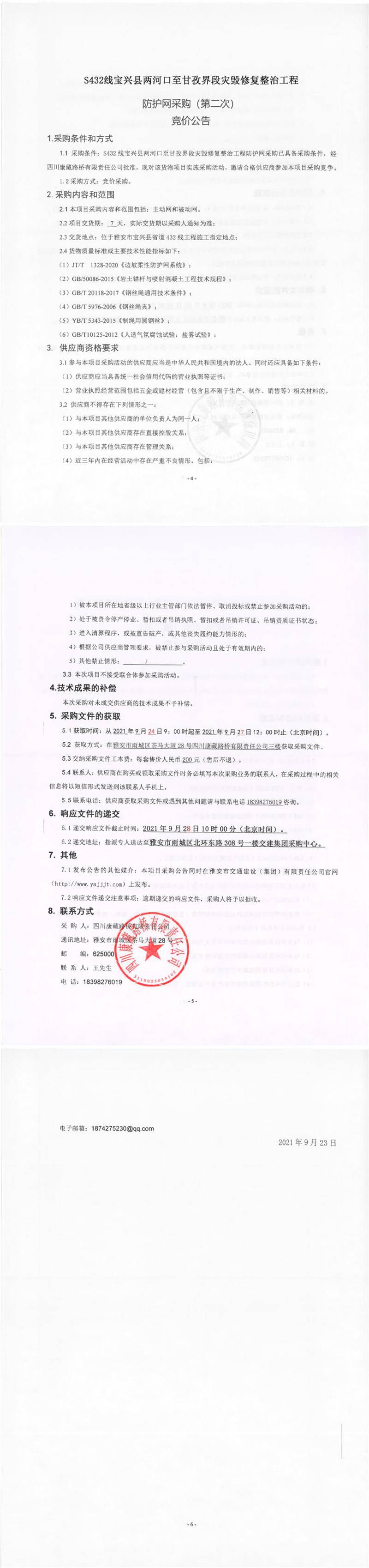 四川康藏路橋有限責任公司S432線寶興縣兩河口至甘孜界段災毀修復整治工程防護網采購(第二次)競價公告