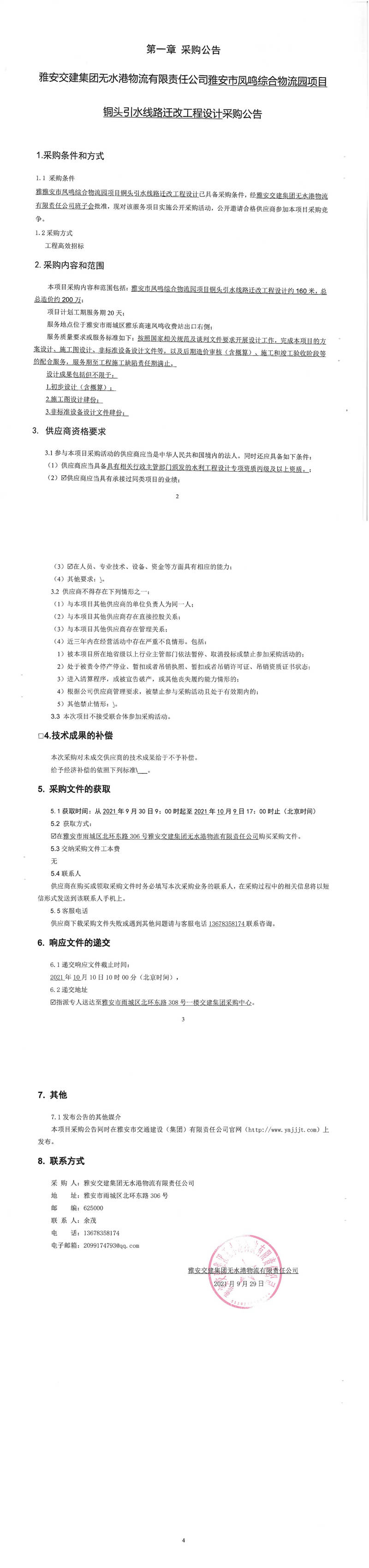 雅安交建集團無水港物流有限責(zé)任公司雅安市鳳鳴綜合物流園項目銅頭引水線路遷改工程設(shè)計采購公告