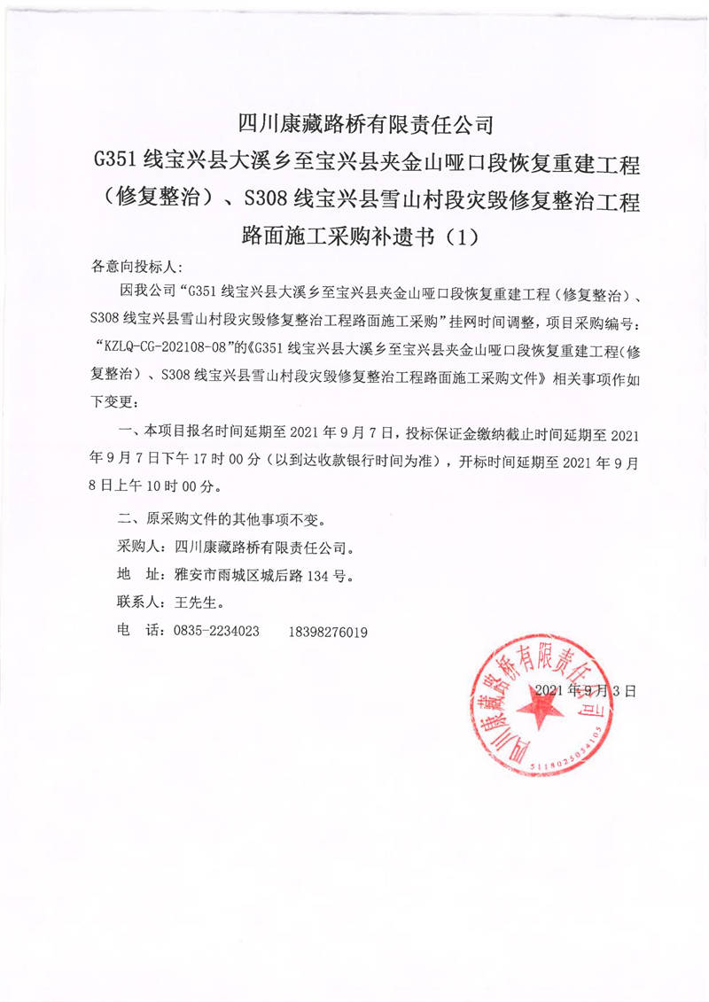 四川康藏路橋有限責(zé)任公司G351線寶興縣大溪鄉(xiāng)至寶興縣夾金山啞口段恢復(fù)重建工程(修復(fù)整治)、S308線寶興縣雪山村段災(zāi)毀修復(fù)整治工程路面施工采購補(bǔ)遺書(1)