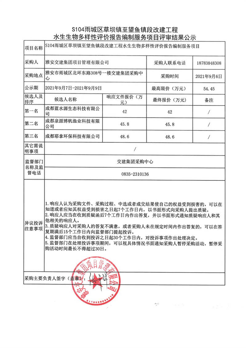 雅安交建集團(tuán)項(xiàng)目管理有限公司S104雨城區(qū)草壩鎮(zhèn)至望魚(yú)鎮(zhèn)段改建工程水生生物多樣性評(píng)價(jià)報(bào)告編制服務(wù)項(xiàng)目評(píng)審結(jié)果公示