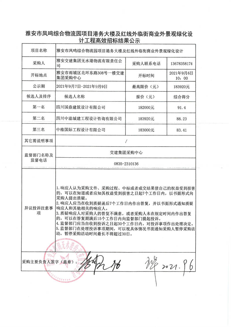 雅安交建集團無水港物流有限責任公司雅安市鳳鳴綜合物流園項目港務大樓及紅線外臨街商業(yè)外景觀綠化設計工程高效招標結果公示