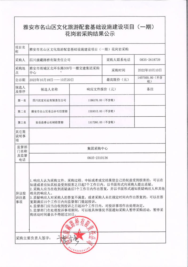 四川康藏路橋有限責任公司雅安市名山區(qū)文化旅游配套基礎設施建設項目(一期)花崗巖采購結果公示