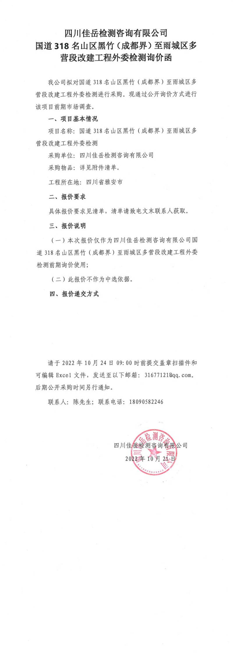 四川佳岳檢測咨詢有限公司國道318名山區(qū)黑竹(成都界)至雨城區(qū)多營段改建工程外委檢測詢價(jià)函