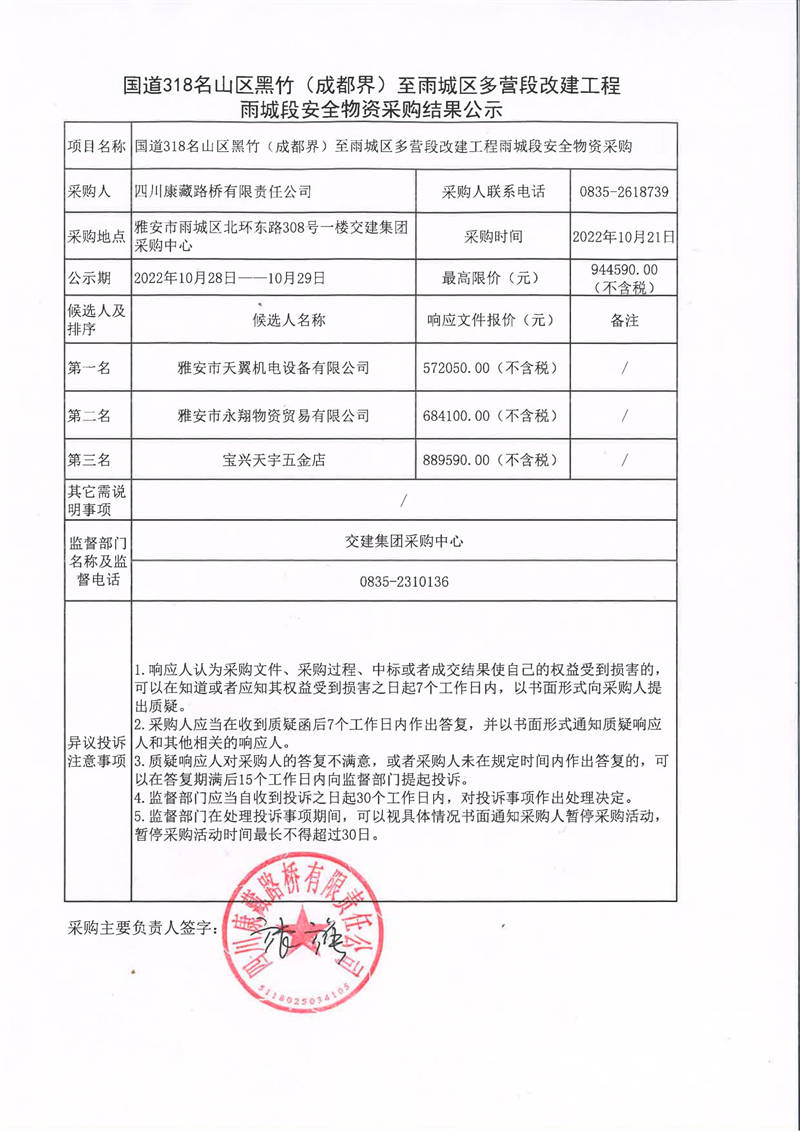 四川康藏路橋有限責任公司國道318名山區(qū)黑竹(成都界)至雨城區(qū)多營段改建工程雨城段安全物資采購結(jié)果公示