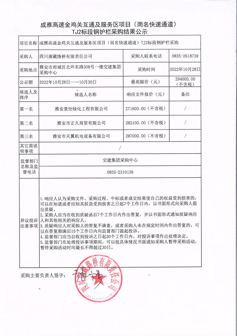 四川康藏路橋有限責(zé)任公司成都高速金雞關(guān)互通及服務(wù)區(qū)項(xiàng)目(雨名快速通道)TJ2標(biāo)段鋼護(hù)欄采購(gòu)結(jié)果公示