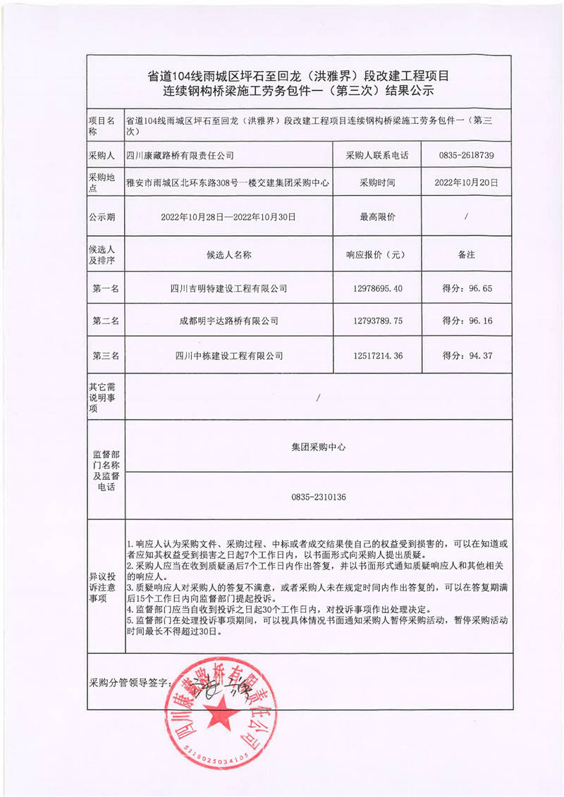 四川康藏路橋有限責任公司省道104線雨城區(qū)坪石至回龍(洪雅界)段改建工程項目連續(xù)鋼構(gòu)橋梁施工勞務(wù)包件一(第三次)結(jié)果公示