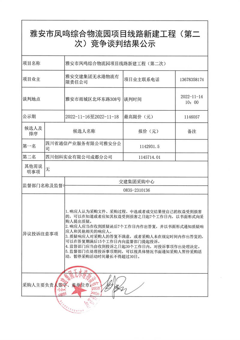 雅安交建集團(tuán)無(wú)水港物流有限責(zé)任公司雅安市鳳鳴綜合物流園項(xiàng)目線路新建工程(第二次)競(jìng)爭(zhēng)談判結(jié)果公示