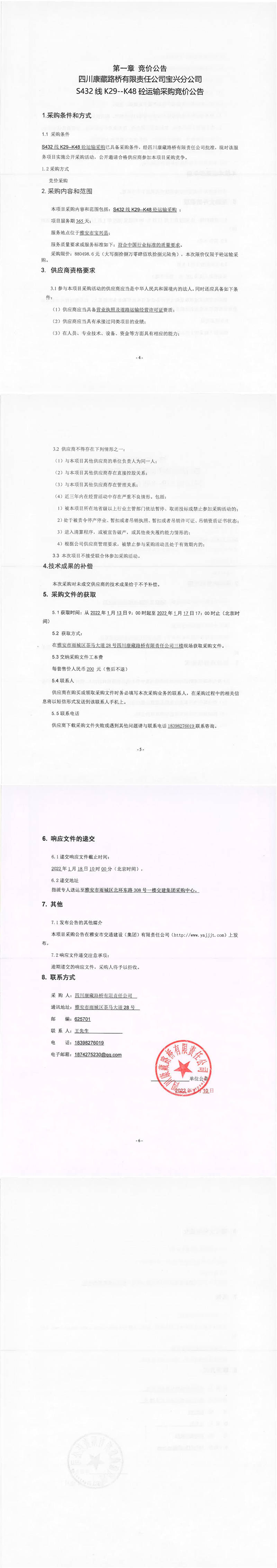 四川康藏路橋有限責(zé)任公司寶興分公司S432線K29-K48砼運輸采購競價公告