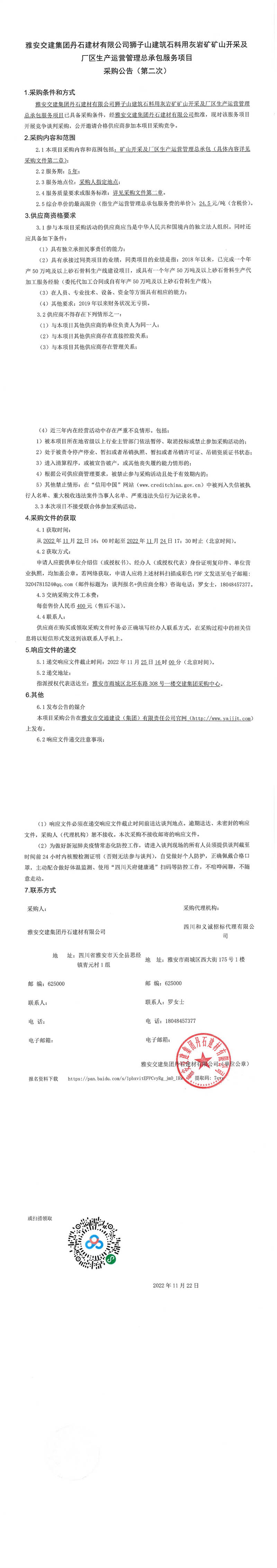 雅安交建集團(tuán)丹石建材有限公司獅子山建筑石料用灰?guī)r礦礦山開采及廠區(qū)生產(chǎn)運(yùn)營(yíng)管理總承包服務(wù)項(xiàng)目采購公告(第二次)
