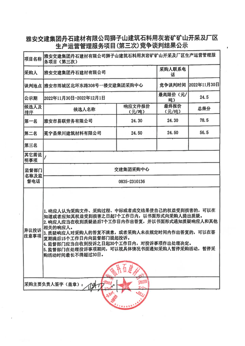 雅安交建集團(tuán)丹石建材有限公司獅子山建筑石料用灰?guī)r礦礦山開(kāi)采及廠區(qū)生產(chǎn)運(yùn)營(yíng)管理服務(wù)項(xiàng)目(第三次)競(jìng)爭(zhēng)談判結(jié)果公示