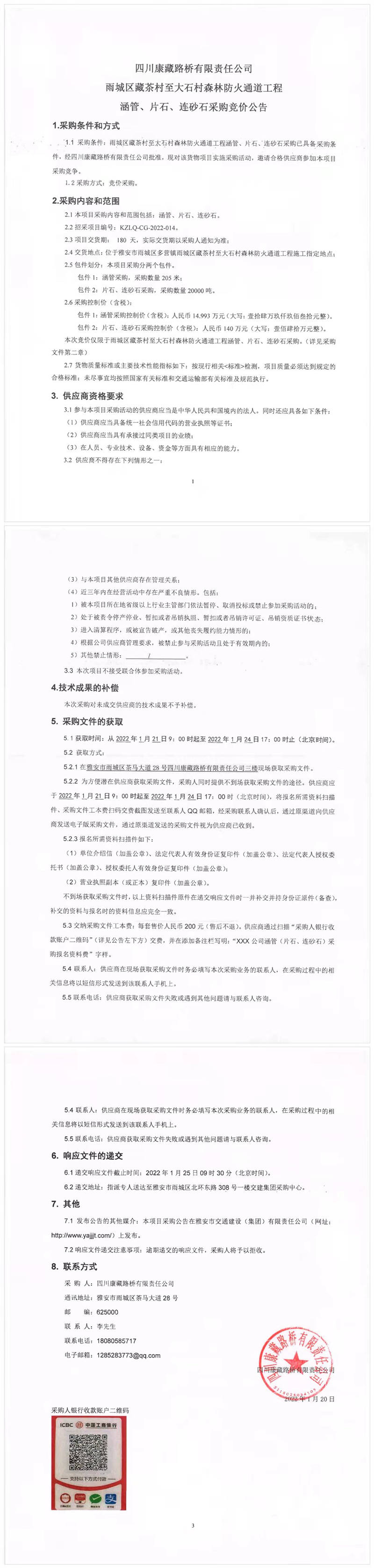 四川康藏路橋有限責任公司雨城區(qū)藏茶村至大石村森林防火通道工程涵管、片石、連砂石采購競價公告