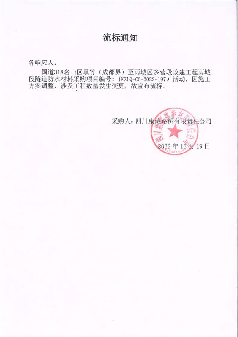四川康藏路橋有限責(zé)任公司國(guó)道318名山區(qū)黑竹(成都界)至雨城區(qū)多營(yíng)段改建工程雨城段隧道防水材料采購(gòu)流標(biāo)通知