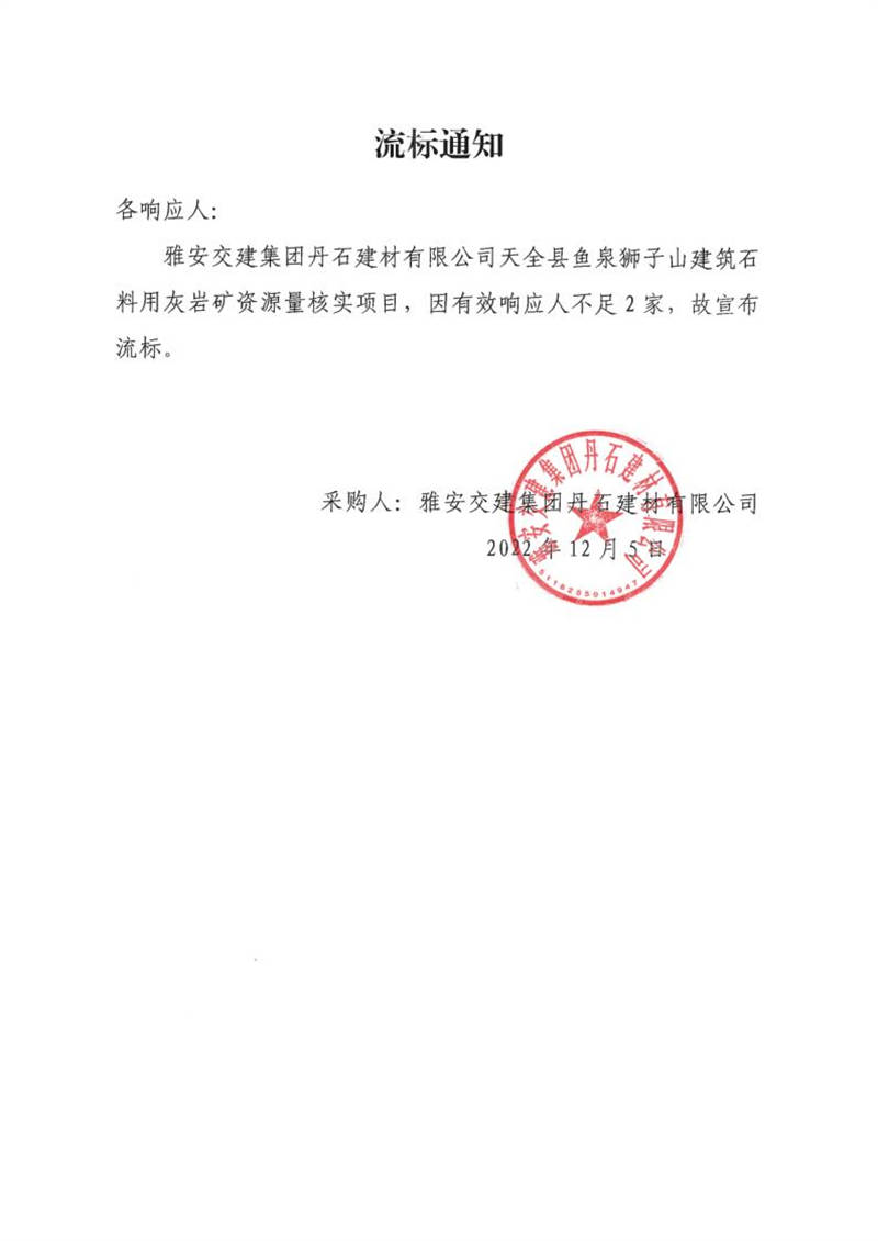 雅安交建集團(tuán)丹石建材有限公司天全縣魚(yú)泉獅子山建筑石料用灰?guī)r礦資源量核實(shí)項(xiàng)目流標(biāo)通知