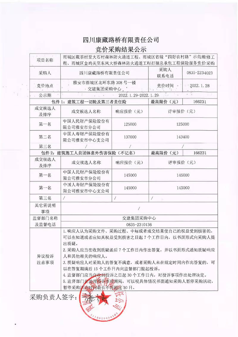 四川康藏路橋有限責任公司雨城區(qū)藏茶村至大石村森林防火通道工程、雨城區(qū)省級“四好農(nóng)村路”示范維修工程、雨城區(qū)金雞關(guān)至東風大橋森林防火通道工程打捆總承包工程保險服務競價采購結(jié)果公示