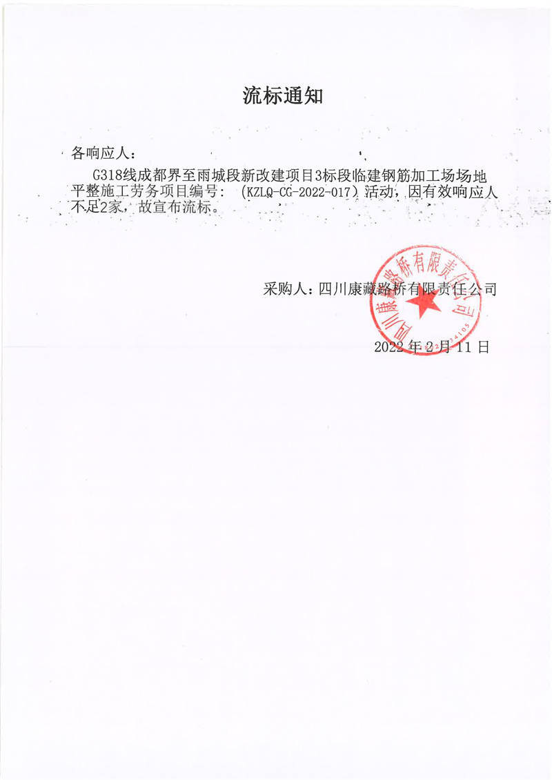 四川康藏路橋有限責(zé)任公司G318線(xiàn)成都界至雨城段新改建項(xiàng)目3標(biāo)段臨建鋼筋加工場(chǎng)場(chǎng)地平整施工勞務(wù)項(xiàng)目流標(biāo)通知
