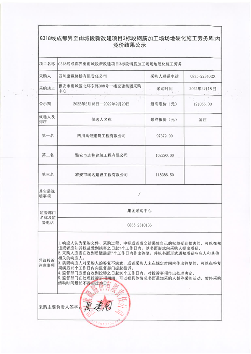 四川康藏路橋有限責(zé)任公司G318線成都界至雨城段新改建項(xiàng)目3標(biāo)段鋼筋加工場(chǎng)場(chǎng)地硬化施工勞務(wù)庫(kù)內(nèi)競(jìng)價(jià)結(jié)果公示