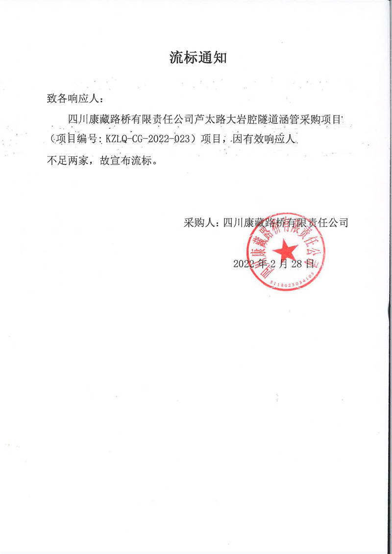 四川康藏路橋有限責(zé)任公司蘆太路大巖腔隧道涵管采購項目流標(biāo)通知