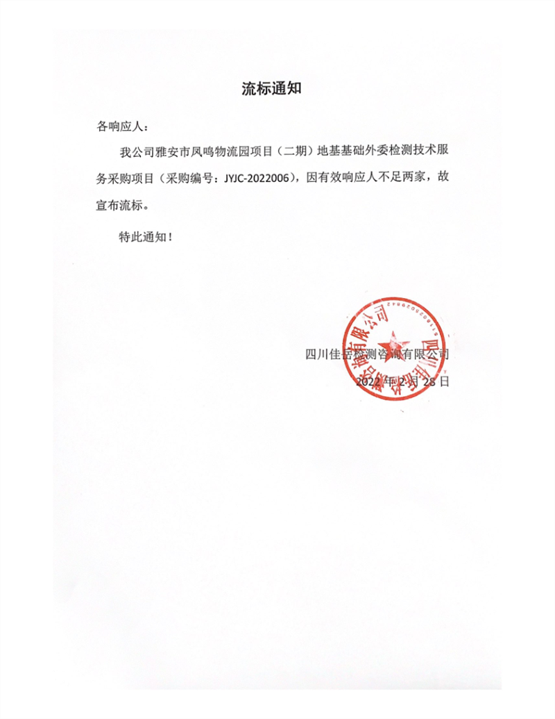 四川佳岳檢測咨詢有限公司雅安市鳳鳴物流園項目(二期)地基基礎外委檢測技術(shù)服務采購項目流標通知