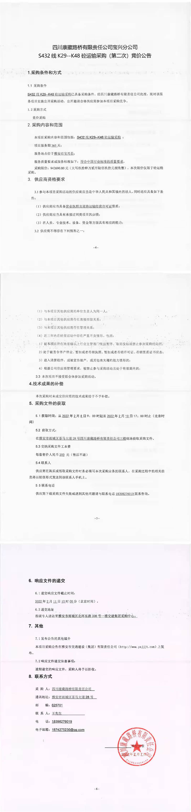 四川康藏路橋有限責(zé)任公司寶興分公司S432線K29-K48砼運(yùn)輸采購(第二次)競(jìng)價(jià)公告