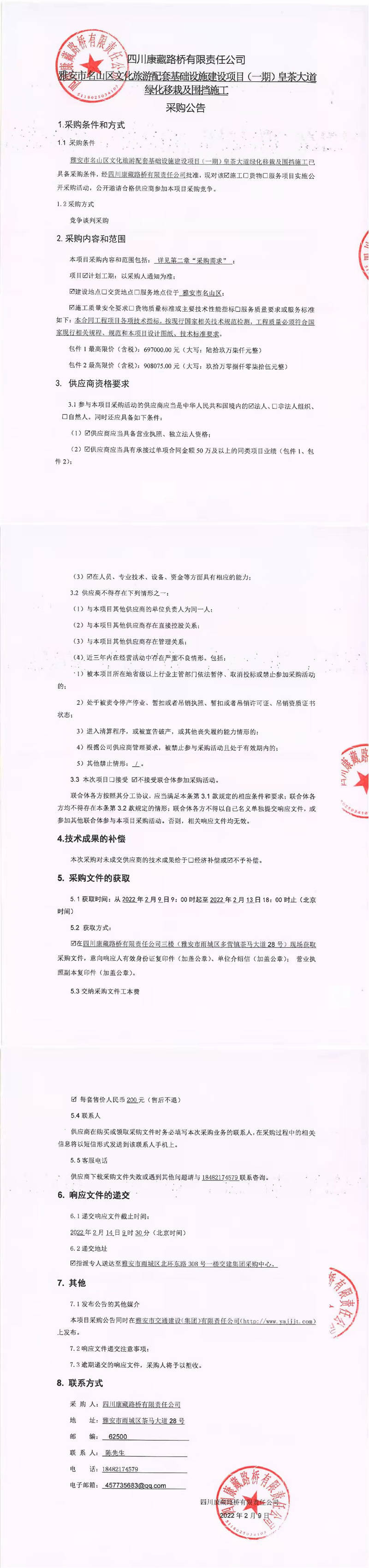 四川康藏路橋有限責任公司雅安市名山區(qū)文化旅游配套基礎(chǔ)設(shè)施建設(shè)項目(一期)皇茶大道綠化移栽及圍擋施工采購公告