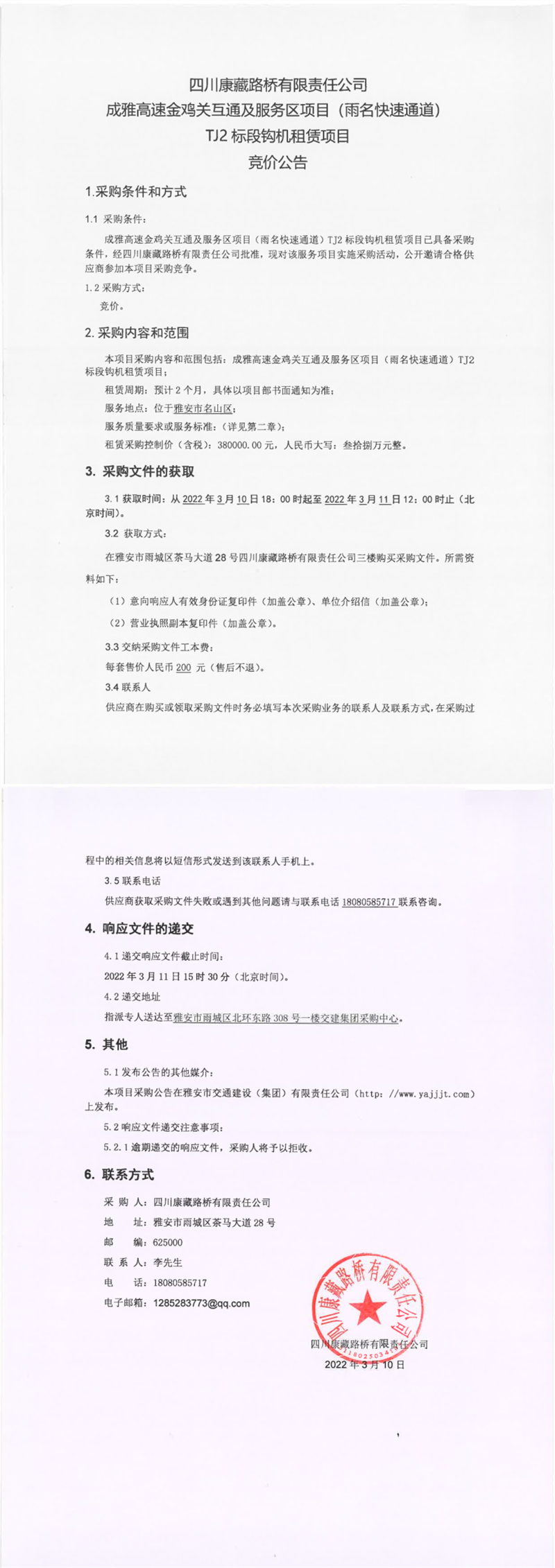 四川康藏路橋有限責任公司成雅高速金雞關互通及服務區(qū)項目(雨名快速通道)TJ2標段鉤機租賃項目競價公告