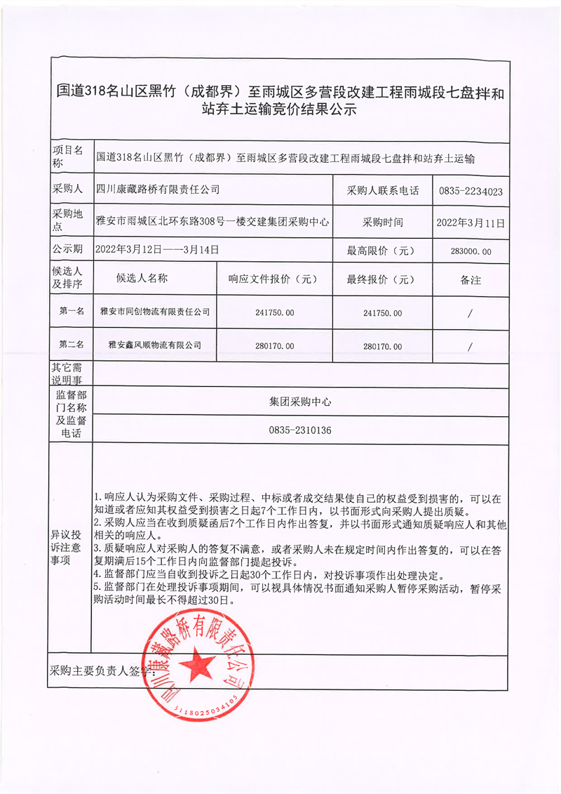 四川康藏路橋有限責(zé)任公司國道318名山區(qū)黑竹(成都界)至雨城區(qū)多營段改建工程雨城段七盤拌和站棄土運輸競價結(jié)果公示