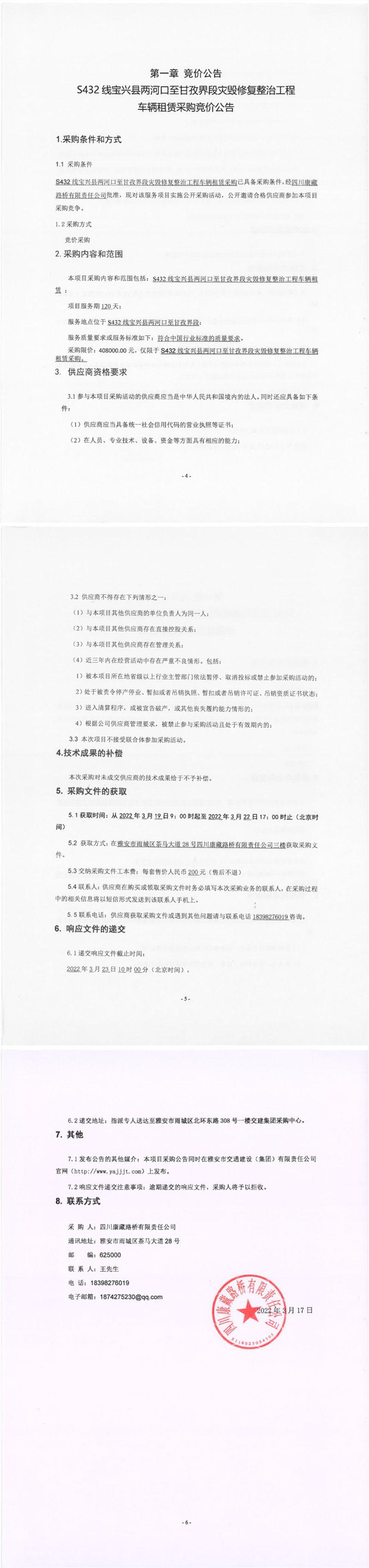 四川康藏路橋有限責(zé)任公司S432線寶興縣兩河口至甘孜界段災(zāi)毀修復(fù)整治工程車(chē)輛租賃采購(gòu)競(jìng)價(jià)公告