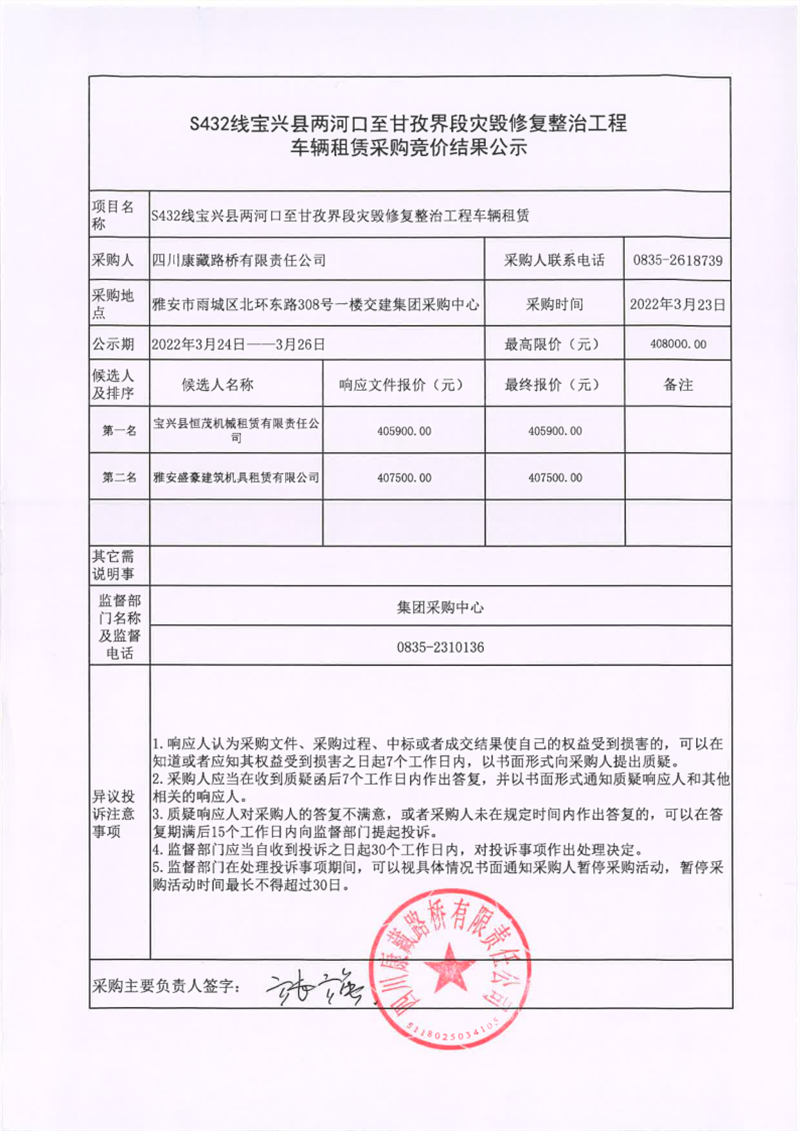 四川康藏路橋有限責任公司S432線寶興縣兩河口至甘孜界段災毀修復整治工程車輛租賃采購競價結(jié)果公示