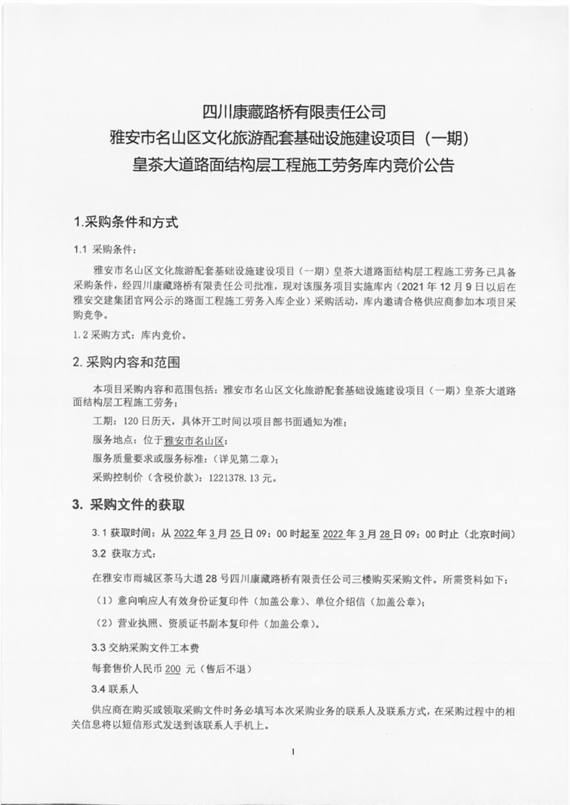 四川康藏路橋有限責任公司雅安市名山區(qū)文化旅游配套基礎設施建設項目(一期)皇茶大道路面結構層工程施工勞務庫內(nèi)競價公告