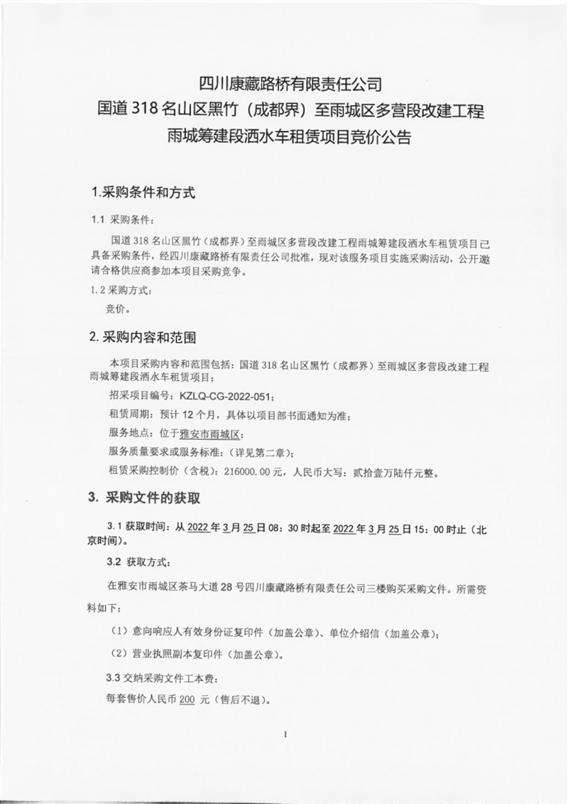 四川康藏路橋有限責任公司國道318名山區(qū)黑竹(成都界)至雨城區(qū)多營段改建工程雨城籌建段灑水車租賃項目競價公告