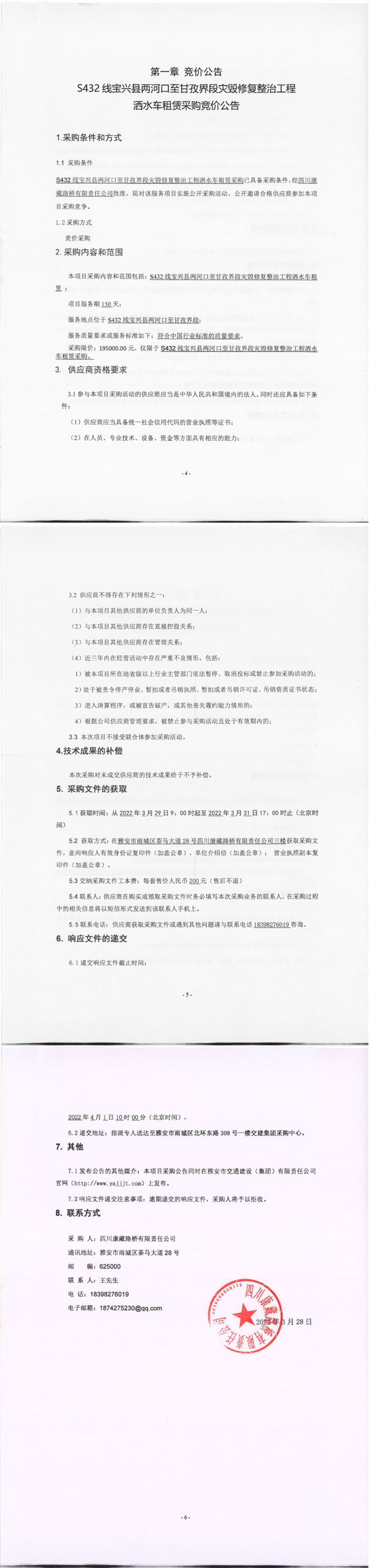 四川康藏路橋有限責(zé)任公司S432線寶興縣兩河口至甘孜界段災(zāi)毀修復(fù)整治工程灑水車租賃采購(gòu)競(jìng)價(jià)公告