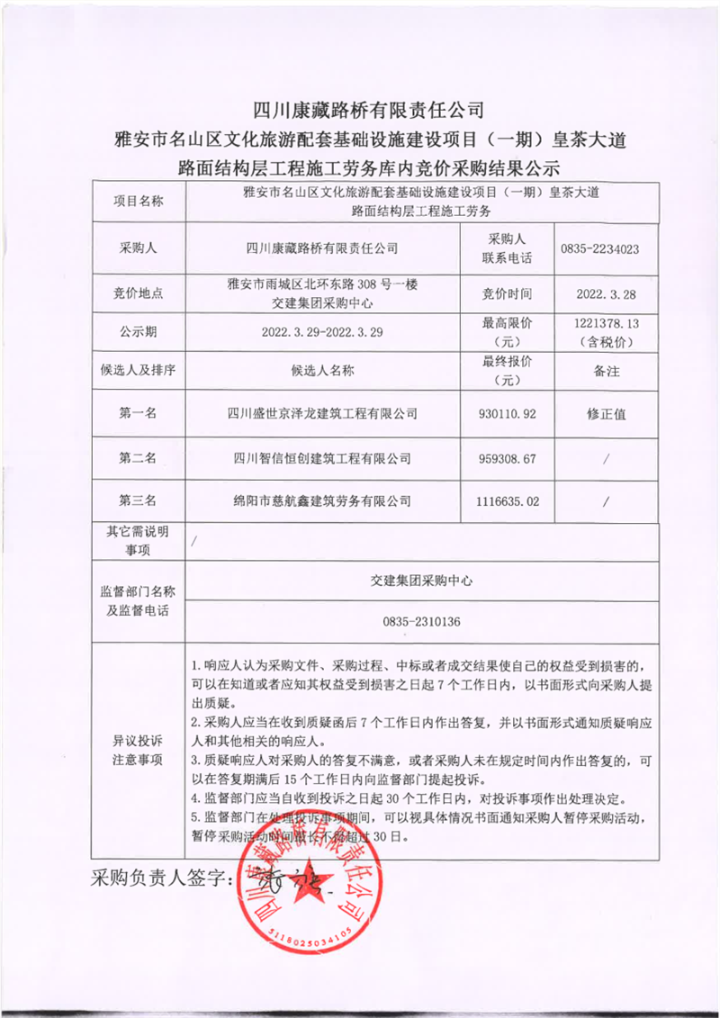 四川康藏路橋有限責(zé)任公司雅安市名山區(qū)文化旅游配套基礎(chǔ)設(shè)施建設(shè)項目(一期)路面結(jié)構(gòu)層工程施工勞務(wù)庫內(nèi)競價采購結(jié)果公示