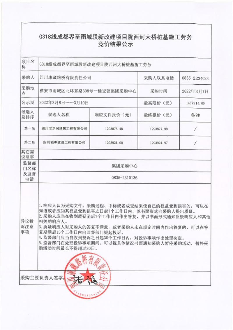 四川康藏路橋有限責(zé)任公司G318線成都界至雨城段新改建項(xiàng)目隴西河大橋樁基施工勞務(wù)競價結(jié)果公示