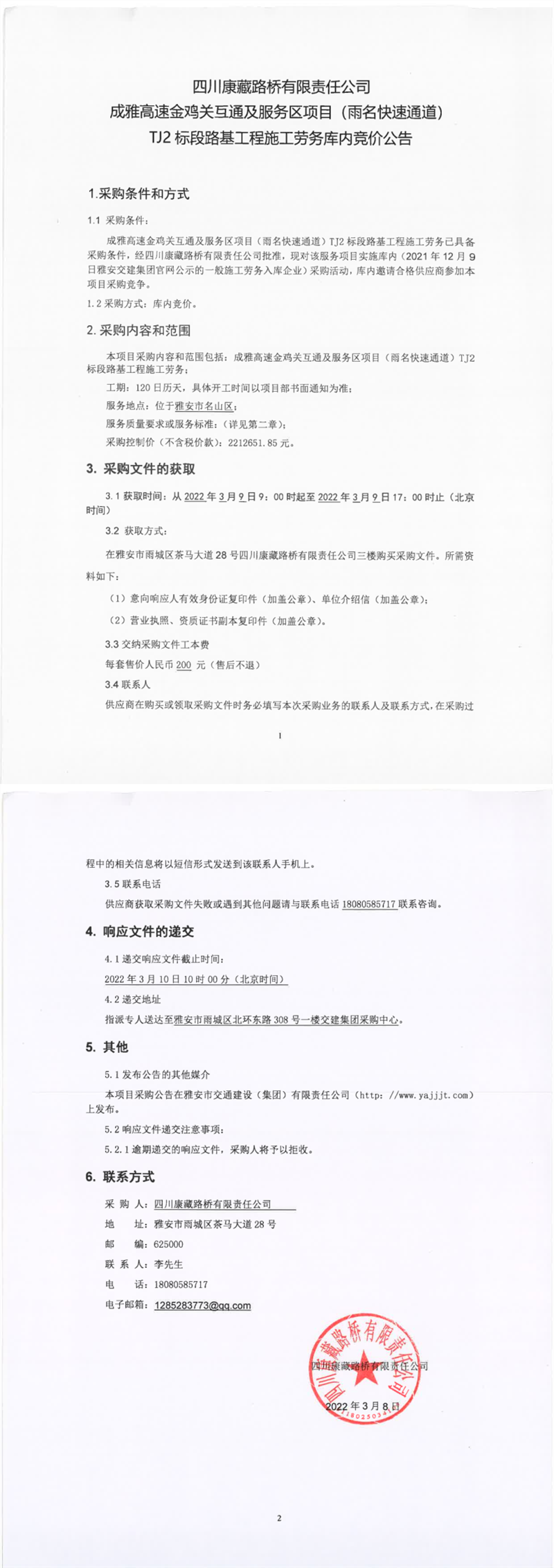 四川康藏路橋有限責(zé)任公司成雅高速金雞關(guān)互通及服務(wù)區(qū)項目(雨名快速通道)TJ2標(biāo)段路基工程施工勞務(wù)庫內(nèi)競價公告