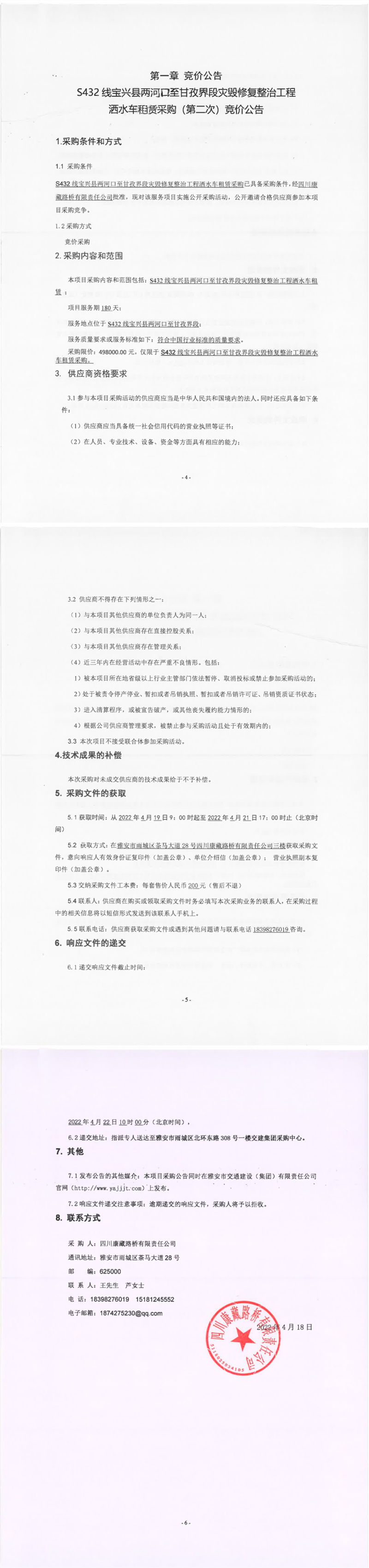 四川康藏路橋有限責(zé)任公司S432線寶興縣兩河口至甘孜界段災(zāi)毀修復(fù)整治工程灑水車租賃采購(第二次)競價公告