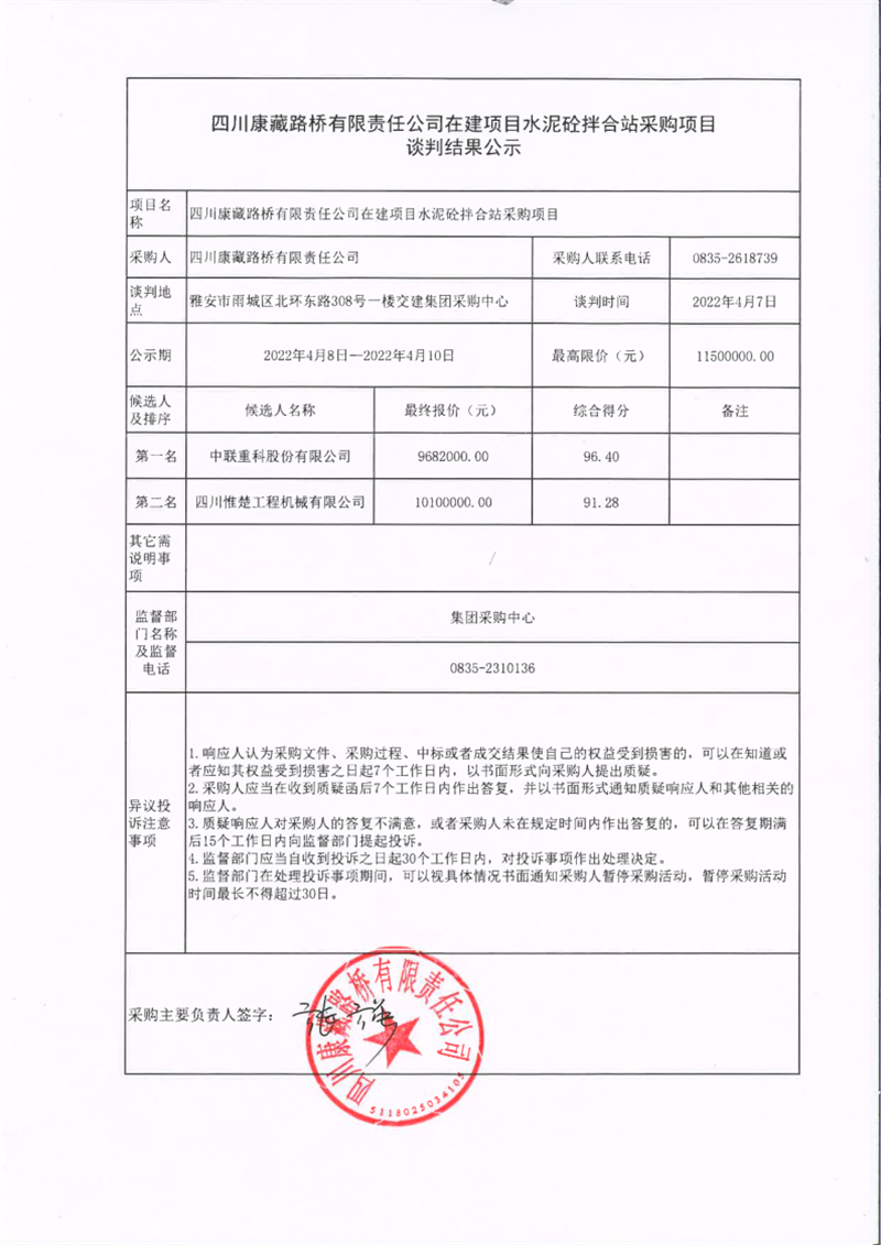 四川康藏路橋有限責(zé)任公司在建項(xiàng)目水泥砼拌合站采購(gòu)項(xiàng)目談判結(jié)果公示