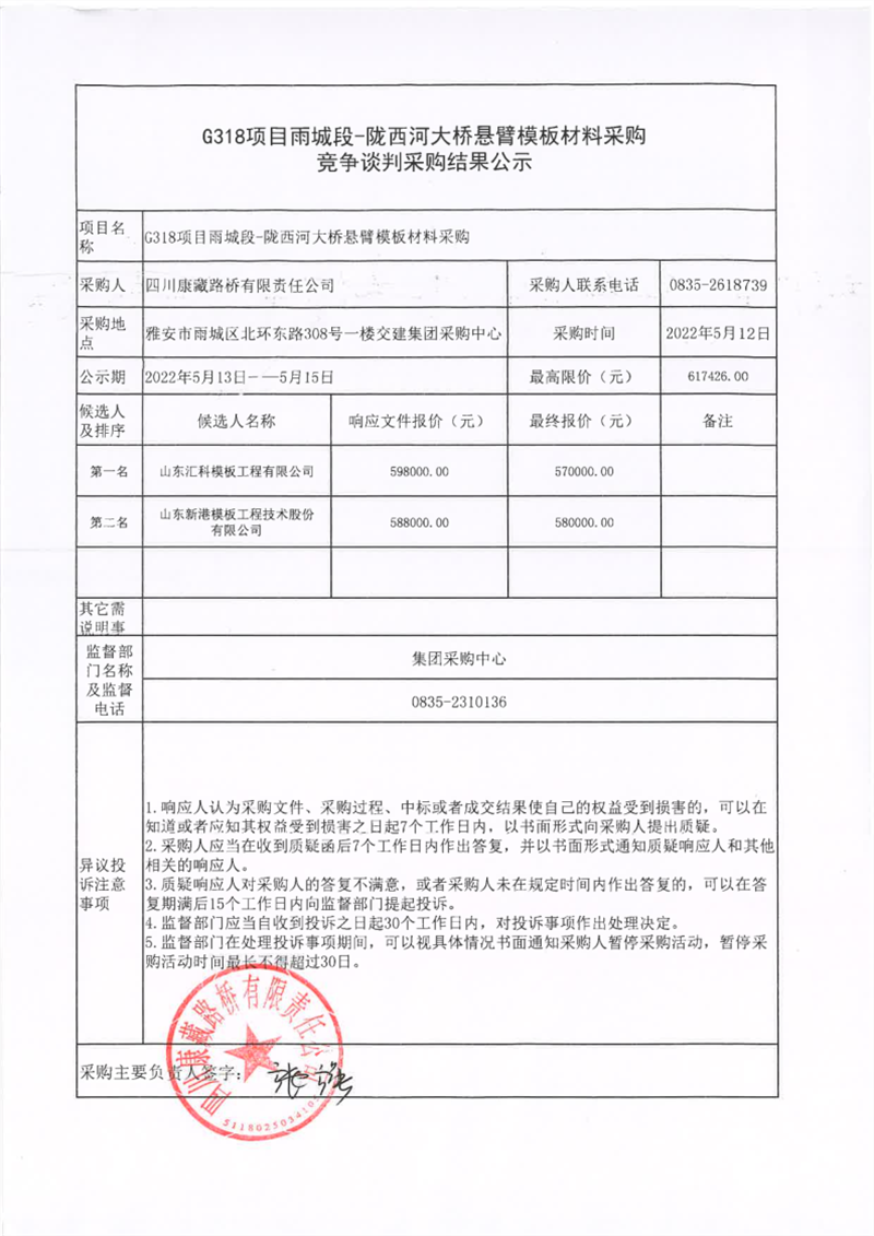 四川康藏路橋有限責(zé)任公司G318項(xiàng)目雨城段-隴西河大橋懸臂模板材料采購競(jìng)爭(zhēng)談判采購結(jié)果公示