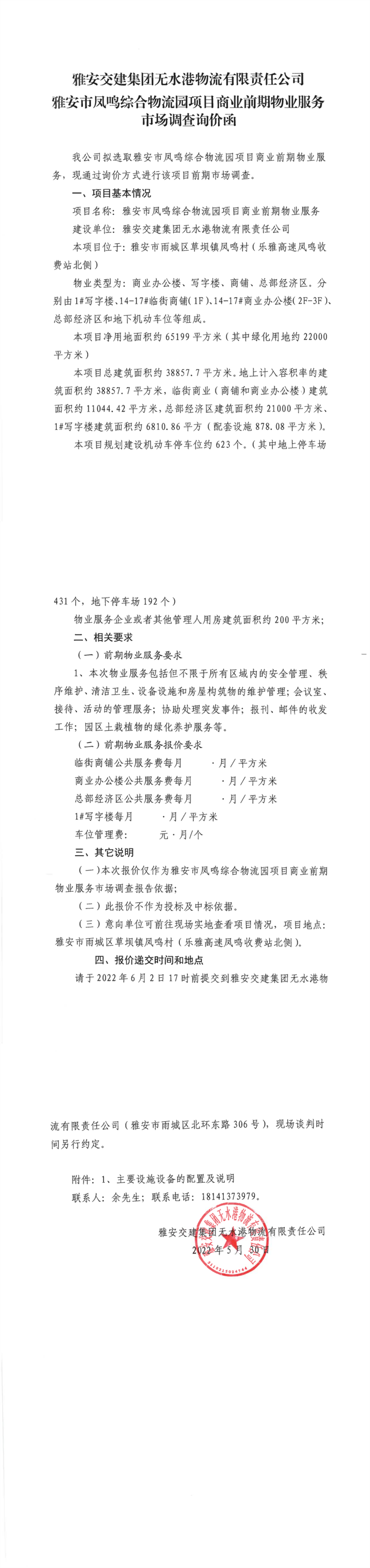 雅安交建集團(tuán)無水港物流有限責(zé)任公司雅安市鳳鳴綜合物流園項(xiàng)目商業(yè)前期物業(yè)服務(wù)市場(chǎng)調(diào)查詢價(jià)函